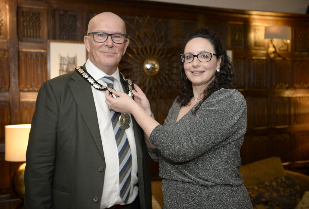 Immediate Past President Jade Wilcox presents incoming President David Fry with the Chain of Office